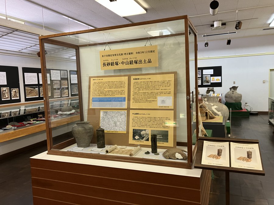 長砂経塚と中山経塚から出土した、「経筒」や「鉄製の短刀」、「法華経第六巻」などを展示しています。