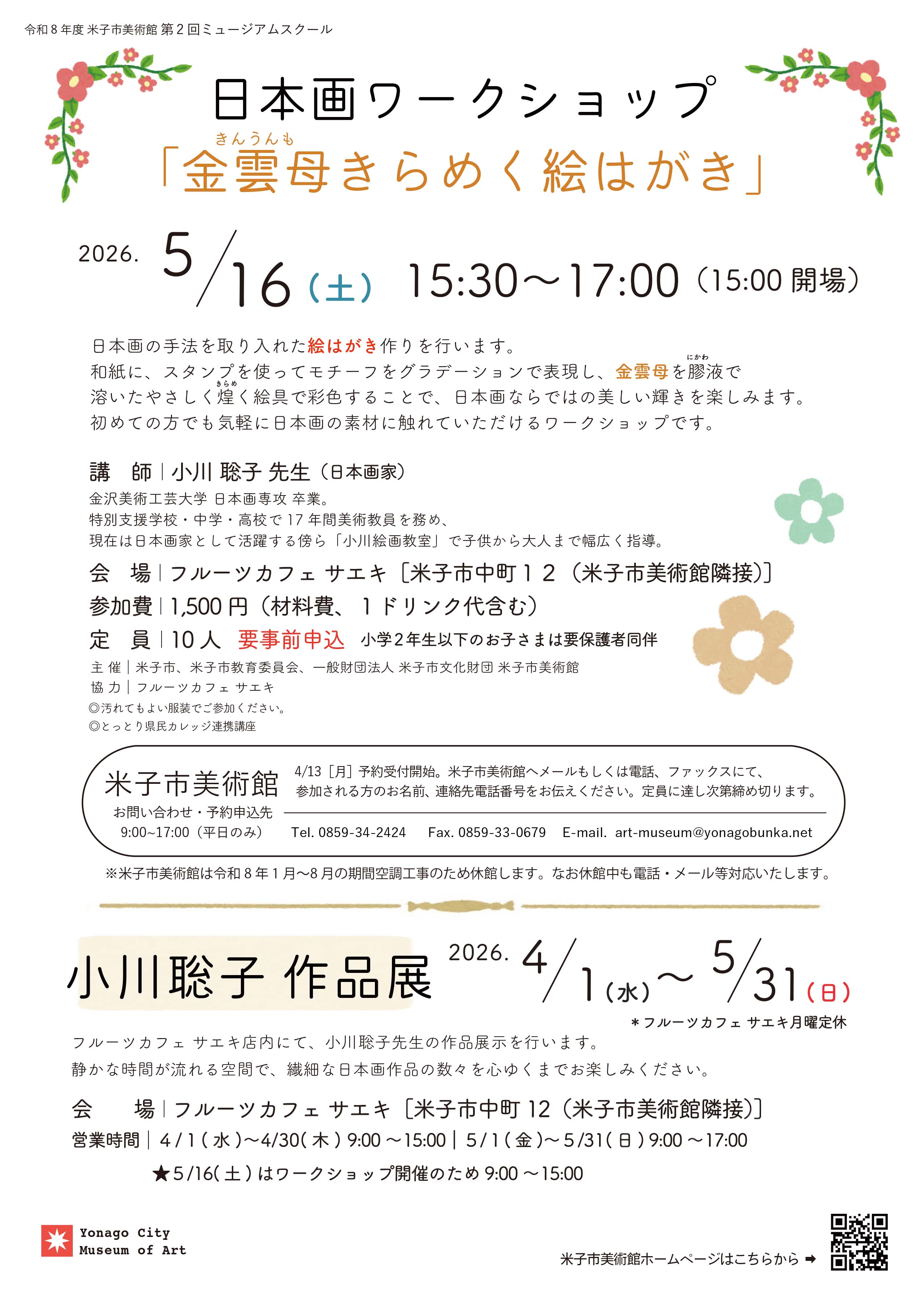 米子市美術館(令和8年8月末までの休館中は、受付時間 平日午前9時〜午後5時)へ 電話 0859-34-2424 かファックス0859-33-0679