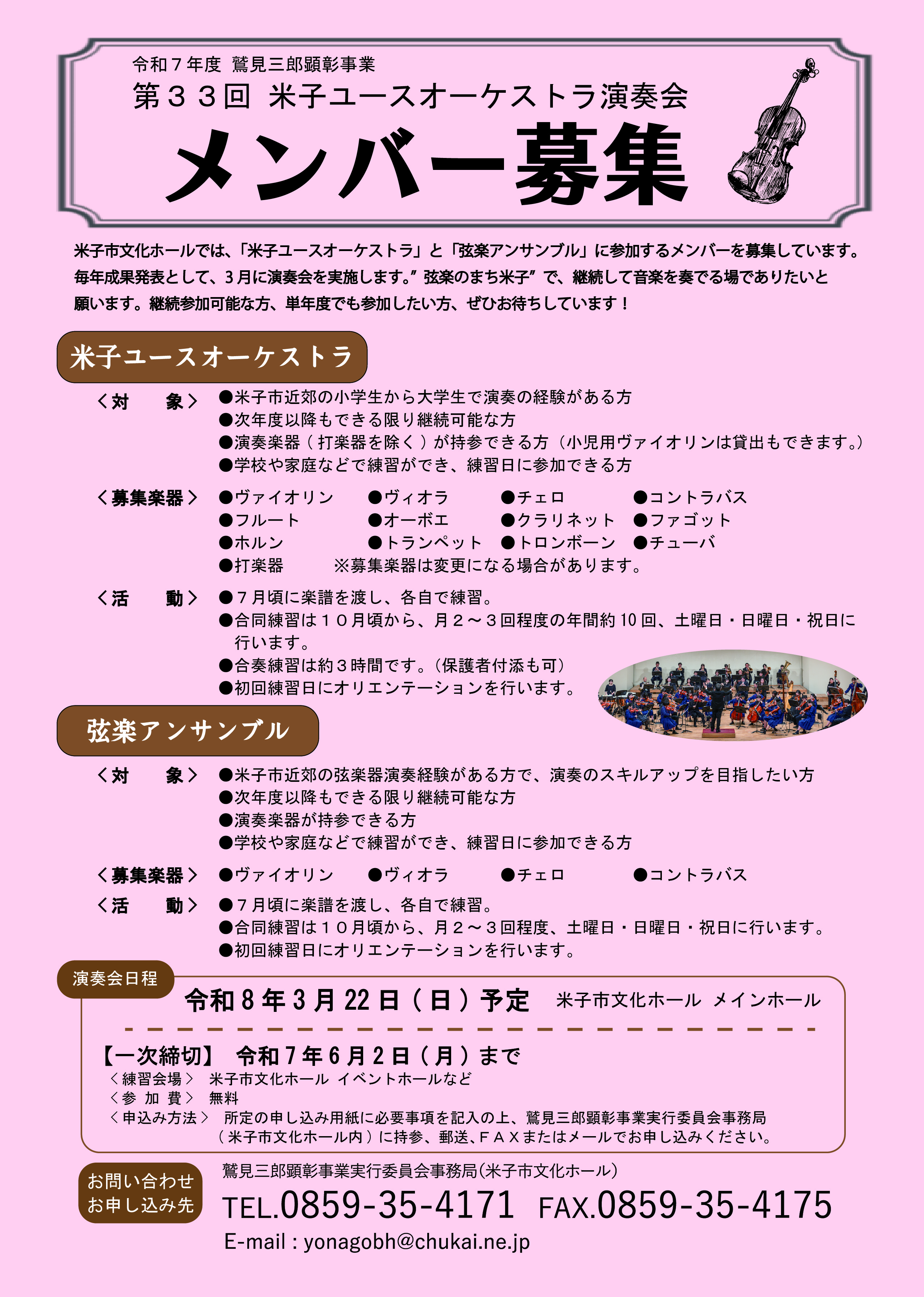 令和7年度鷲見三郎顕彰事業「米子ユースオーケストラ」、「弦楽アンサンブル」のメンバーを募集します。