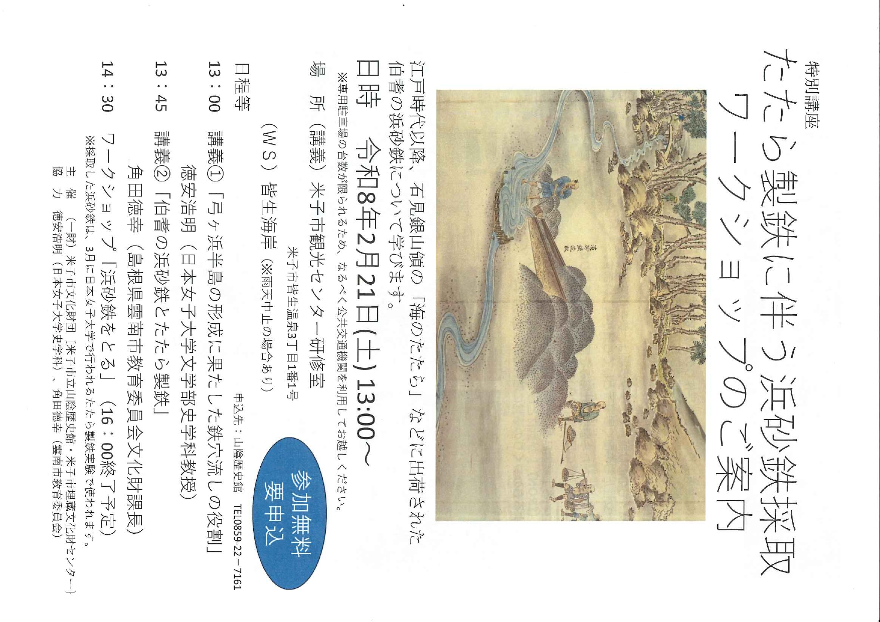 <講義> ①13:00~「弓ヶ浜半島の形成に果たした鉄穴流し」徳安浩明(日本女子大学文学部史学科教授) ②13:45~「伯耆の浜砂鉄とたたら製鉄」角田徳幸(島根県雲南市教育委員会文化財課長)